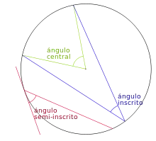 Ángulo semi-inscrito, si su vértice está sobre esta, uno de sus lados la corta y el otro es tangente, siendo el punto de tangencia el propio vértice.