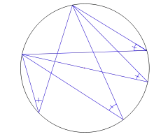 - La amplitud de un ángulo inscrito es la mitad de la del arco que abarca. (Véase: arco capaz.)
