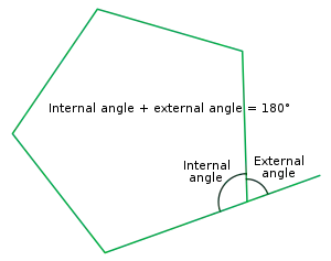 - En geometría euclidiana, la suma de los ángulos exteriores de un polígono convexo simple, si solo se supone uno de los dos ángulos exteriores en cada vértice, será una vuelta completa (360 °). El ángulo exterior aquí se llama «ángulo exterior suplementario». Los ángulos exteriores se usan comúnmente en los programas de Logo Turtle al dibujar polígonos regulares.