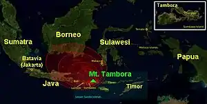 - 10 a 11 de abril: en las islas menores de la Sonda (Indonesia) se produce la erupción del volcán Tambora con gran explosividad, dejando un saldo de alrededor de 82 000 muertos. El volcán propulsó miles de toneladas de compuestos de gas sulfuro a la estratosfera que reflejaban la luz solar y causaron un enfriamiento generalizado y fuertes lluvias, provocando que el verano de 1816, sea conocido como el año sin verano.