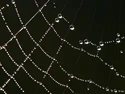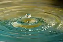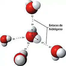 La polaridad de la molécula de agua da lugar a fuerzas de Van der Waals y la formación de hasta cuatro enlaces de hidrógeno con moléculas circundantes.[24] Estos enlaces moleculares explican la adhesividad del agua, su elevado índice de tensión superficial y su capilaridad, que es responsable de la formación de ondas capilares, permite a algunos animales desplazarse sobre la superficie del agua y contribuye al transporte de la savia contra la gravedad en las plantas vasculares, como los árboles.[25][26] La presencia en el agua de ciertas sustancias surfactantes, como jabones y detergentes, reduce notablemente la tensión superficial del agua y facilita la retirada de la suciedad adherida a objetos.[18]