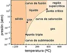 A presiones por debajo de 0,006 atm, el agua no puede existir en el estado líquido y pasa directamente del sólido al gas por sublimación, fenómeno explotado en la liofilización de alimentos y compuestos.[17] A presiones por encima de 221 atm, los estados de líquido y de gas ya no son distinguibles, un estado llamado agua supercrítica. En este estado, el agua se utiliza para catalizar ciertas reacciones y tratar residuos orgánicos.
