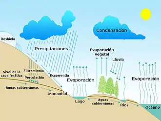 El agua cambia constantemente su posición de una a otra parte del ciclo de agua y se pueden distinguir numerosas componentes[77] que implican básicamente los siguientes procesos físicos: