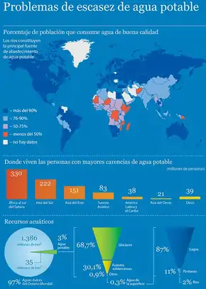 Se estima que aproximadamente el 70 % del agua dulce se destina a la agricultura.[6] El agua en la industria absorbe una media del 20 % del consumo mundial, empleándose en tareas de refrigeración, transporte y como disolvente en una gran variedad de procesos industriales. El consumo doméstico absorbe el 10 % restante.[7] El acceso al agua potable se ha incrementado durante las últimas décadas en prácticamente todos los países.[8][9] Sin embargo, estudios de la FAO estiman que uno de cada cinco países en vías de desarrollo tendrá problemas de escasez de agua antes de 2030; en esos países es vital un menor gasto de agua en la agricultura, modernizando los sistemas de riego.[7]