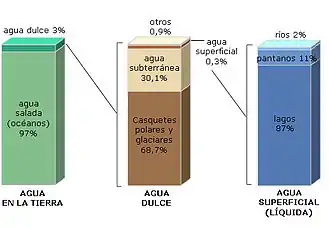Los océanos y mares de agua salada cubren el 71 % de la superficie de la Tierra. Solo el 3 % del agua terrestre es dulce, y de este volumen, solo el 1 % está en estado líquido. El 2 % restante se encuentra en estado sólido en capas, campos y plataformas de hielo o banquisas en las latitudes próximas a los polos. Fuera de las regiones polares el agua dulce se encuentra principalmente en humedales y, subterráneamente, en acuíferos. Según un estudio publicado en la revista Nature Geoscience, se estima que el agua subterránea total en el planeta supone un volumen de 23 millones de kilómetros cúbicos.[75]