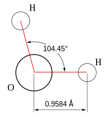 La molécula de agua adopta una geometría no lineal, con los dos átomos de hidrógeno formando un ángulo de 104,45 grados entre sí. Esta configuración, junto con la mayor electronegatividad del átomo de oxígeno, le confieren polaridad a la molécula, cuyo momento dipolar eléctrico es de 6,2 × 10−30 C m.[23]