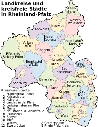 El Land de Renania-Palatinado se divide, directamente, en 24 distritos territoriales (Landkreise) y 12 ciudades autónomas o "no integradas en distritos" (kreisfreie Städte).