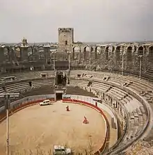 - Las arenas de Arlés son un anfiteatro romano construido hacia 80-90, poco después del Coliseo de Roma del que toma las principales características. Incluye un sistema de evacuación por numerosos pasillos de acceso, una escena central de forma elíptico rodeada con gradas, con los soportales, aquí sobre dos niveles, a lo largo de un total de 136 metros. Este edificio acoge hoy en día manifestaciones esencialmente taurinas.