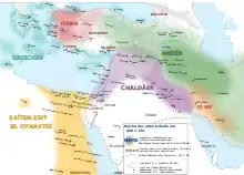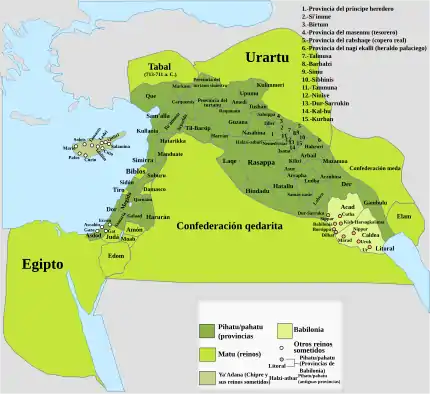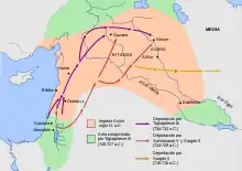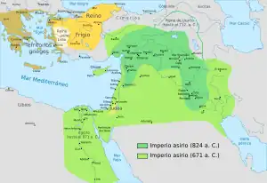 ![]() Corazón del imperio asirio. Máxima extensión de Asiria, durante el reinado de Asurbanipal (668-627 aC). | ||||||||||||||||||||||||||||||||||