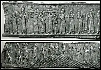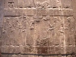 Su sucesor fue su hijo Salmanasar III (858-824 a. C.) cuyo reinado duró treinta y cinco años a lo largo de los cuales llegó a realizar treinta y dos batallas. Venció a Siria e Israel que se habían aliado contra su enemiga Asiria y les obligó a pagar tributo. Existe como testimonio un obelisco negro encontrado en las ruinas de Calach; en él se representa a Jehú de Israel besando los pies de Salmanasar; también se encontraron unas placas de bronce batido que se conocen como Puertas de Balawat.[77][78]