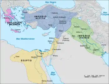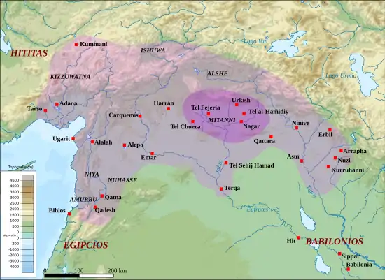Muchos de estos pueblos nómadas del norte de Mesopotamia, conquistadores, se fueron uniendo hacia el 1500 a. C. hasta constituir un reino llamado Mitani (o Mitanni) que llegó a ser una gran potencia.[30] Incluso Asiria se vio obligada a rendirle tributo a pesar de que su vieja monarquía se seguía sosteniendo. Tal situación se prolongó hasta que accedió al trono el asirio Ashur-uballit I (1365 a. C.-1330 a. C.) que invadió y saqueó la capital del reino mitani en un momento de su historia en que ya se encontraba debilitado. Con este rey se inició la fuerza y el poderío de Asiria.[31] Entre 1318 y 1050 a. C. los asirios organizaron su propio imperio, el llamado en la historiografía «Imperio Asirio Medio».[32]
