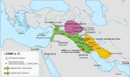 Sargón I de Acad murió c. 2215 a. C.; llegó a dominar Sumeria, Acadia y Asiria. Su nieto Naram-Sin, llamado «rey de las cuatro partes del mundo» continuó la labor de su abuelo y llevó a su pueblo hasta lo más alto. Después de su muerte se fue sucediendo la llegada de los nómadas conquistadores, pueblos que habían estado siempre a la expectativa hasta encontrar el momento propicio de irrumpir y guerrear.[28]