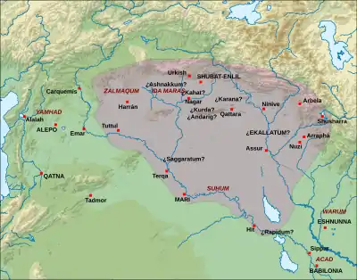 La ciudad de Aššur siguió siendo independiente hasta 1800 a. C., cuando el rey Shamshiadad I de Ekallatum (1815-1775 a. C.) se apoderó de ella y la incorporó en su reino (el reino de la Alta Mesopotamia con su capital Shubat-Enlil en el valle del Jabur).[53] Después de su muerte, su hijo Ishme-Dagan continuó reinando sobre Assur durante una cuarentena de años. La situación después de su muerte no es bien conocida: Assur puede haber sido nuevamente dirigida por soberanos de origen local, a menos que la dinastía de Shamshiadad I no continuase gobernando la ciudad. En cualquier caso, parece que la experiencia de la integración en el reino de la Alta Mesopotamia siguió siendo importante para la historia de Asiria, y Shamshiadad I es siempre considerado un rey asirio por la tradición historiográfica de ese país, bajo el nombre asirio de Shamshi-Adad I, y esto debido a su gran prestigio. Sus antepasados se cuentan entre los primeros reyes de la ciudad en la Lista real asiria, en la que pueden haber sido introducidos por iniciativa de ese rey.[54] La vida política de Assur al final de la época amorrita no se conoce. El prólogo del Código de Hammurabi menciona la ciudad entre las posesiones de ese rey de Babilonia alrededor de 1750 a. C.,[55] pero la dominación babilónica de la Alta Mesopotamia no sobrevivió al hijo de este rey, Samsu-iluna.