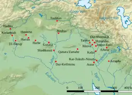 Aššur (s. XXV-IX) Shubat-Enlil (s. XVIII) Kalkhu (809-706) Dur Sharrukin (706) Nínive (705-612) Harrán (612-609) | |||||||||||||||||||||||||||||||||