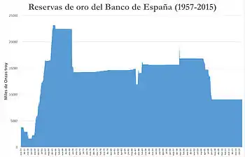 El Banco de España posee 9,1 millones de onzas troy de oro (unas 283 toneladas) (2019),[5] que se encuentran depositadas en sus propias cámaras acorazadas y en diferentes entidades de Londres y Nueva York.[24] En 2004 la reserva total de este metal ascendía a cerca de 17 millones de onzas troy. En el año 2005 se finaliza con 14,7 millones; en 2006, con 13,4 millones, y en diciembre de 2007, tras la venta de una gran parte de las reservas con la reserva actual de 9,05 millones de onzas troy, equivalente a 281,5 toneladas de oro (véase gráfico).[25] De acuerdo con datos del FMI, España ocupa el puesto 20.º dentro de las 40 mayores reservas de oro del mundo (a julio de 2015).[26][27]