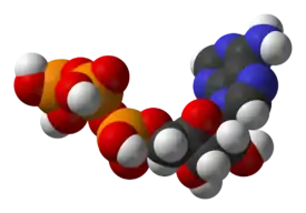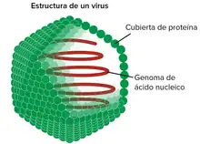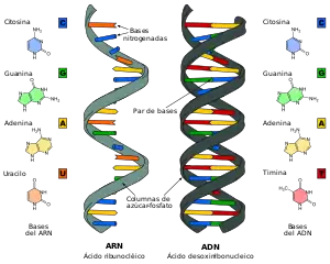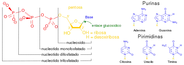 | Ácidos nucleicos | Biopolímeros formados por grupos fosfatos, pentosas (ribosa [ARN] o desoxirribosa [ADN]) y bases nitrogenadas. Estos almacenan, envían y codifican la información genética para la síntesis de proteínas.[72][73][74] Estos se encuentran dentro de las células. | ADN | El ácido desoxirribonucleico (ADN) es el nombre científico de un compuesto químico de moléculas[75] autorreplicantes[76] unidos por enlaces covalentes y puentes de hidrógeno. Son un biopolímero[77] constituido de nucleótidos[78] (conformados por una base nitrogenada[35][79] y un grupo fosfato[77]) y azúcar desoxirribosa.[77] Es el sistema central de almacenamiento de información de la mayoría de los seres vivos,[75] y de incluso algunos virus.[75] Establece el material genético de las células y comprende en su secuencia la información para la síntesis de proteínas[77] y moléculas de ARN.[75] La mayor parte del ADN se encuentra en el interior del núcleo, en el caso de una célula eucariota,[80] o en el citoplasma en el caso de una procarionta;[81] lugares donde se forman los cromosomas; estos contienen proteínas llamadas histonas que se unen al ADN.[75]