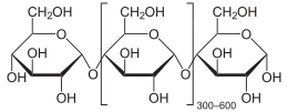 | Polisacáridos | Formados por varios monosacáridos.[59] | Almidón | Es el principal polisacárido de reserva energética de la mayoría de los vegetales.[60] | ![]() | ||||