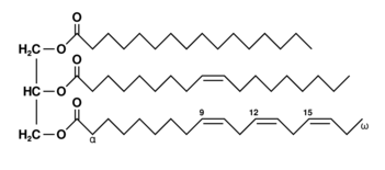 | Lípidos | Los lípidos (del griego lipos que se connota como 'grasa') son biomoléculas formadas principalmente por carbono, hidrógeno y oxígeno. Son insolubles en agua pero solubles en disolventes orgánicos como el benceno o éter.[63] Los lípidos son el resultado de la esterificación de alcoholes con ácidos grasos, de ahí se clasifican en simples, compuestos y derivados.[63] A pesar de que no todos los lípidos contienen ácidos grasos, a estos se les considera como la unidadmonomérica de estos. | Saponificables | Sustancia grasa que puede convertirse en jabón en la combinación con un hidróxido sódico (NaOH).[64] | Triglicéridos | Éster compuesto por un glicerol y tres ácidos grasos. Es el principal compuesto de la grasa tanto corporal como vegetal.[65] Funge como fuente de reserva energética además de funcionar como aislante térmico en los animales. | Saturados | Aquellos cuyos ácidos grasos son saturados. Son de origen animal y se encuentran en estado sólido a temperatura ambiente, por ejemplo el sebo o la manteca. | ![]() |