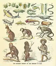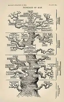 El pensamiento evolutivo serio se originó con las obras de Jean-Baptiste Lamarck, quien fue el primero en presentar una teoría coherente de la evolución.[21] Postuló que la evolución era el resultado del estrés ambiental sobre las propiedades de los animales, lo que significaba que cuanto más frecuente y rigurosamente se usaba un órgano, más complejo y eficiente se volvería, adaptando así al animal a su entorno. Lamarck creía que estos rasgos adquiridos podrían luego transmitirse a la descendencia del animal, que los desarrollaría y perfeccionaría aún más.[22] Sin embargo, fue el naturalista británico Charles Darwin, que combinando el enfoque biogeográfico de Humboldt, la geología uniformista de Lyell, los escritos de Malthus sobre el crecimiento de la población y su propia experiencia morfológica y extensas observaciones naturales, quien forjó una teoría evolutiva más exitosa basada en la selección natural; un razonamiento y pruebas similares llevaron a Alfred Russel Wallace a llegar de forma independiente a las mismas conclusiones.[Ma. 3][La. 1] Aunque fue objeto de controversia (que continúa hasta el día de hoy), la teoría de Darwin se extendió rápidamente a través de la comunidad científica y pronto se convirtió en un axioma central de la ciencia de la biología en rápido desarrollo. El final del siglo XIX vio la caída de la teoría de la generación espontánea y el nacimiento de la teoría microbiana de la enfermedad, aunque el mecanismo de la herencia genética fuera todavía un misterio.