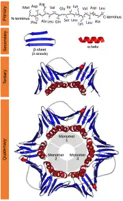 | Cuaternarias | Estructura que expone las uniones entre las diversas cadenas polipeptídicas de la proteína. Solo se presentan en proteínas con más de una cadena polipeptídica. | |||||||