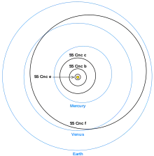 55 Cancri, conocida también por su denominación de Bayer ρ1 Cancri, es una binaria cuya componente principal —una enana amarilla de tipo G8V que recibe el nombre de Copérnico— alberga un sistema planetario con cinco planetas al menos. Uno de los planetas, llamado Janssen, tiene una masa 8,3 veces mayor que la Tierra y un diámetro doble al de nuestro planeta.[13] En su atmósfera se han detectado hidrógeno y helio, pero no vapor de agua.[14]
