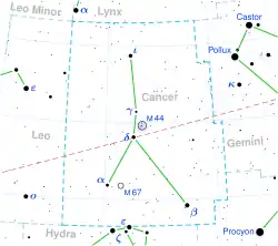 - γ Cancri (Asellus Borealis), uno de los asnos que flanquean el cúmulo del Pesebre (M44) —Asellus significa «asno» en latín—, es una estrella blanca de magnitud 4,67.
