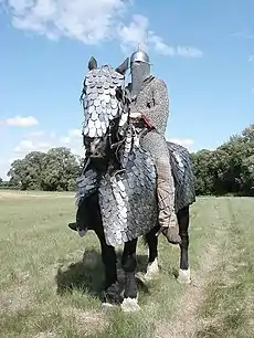 Armar y dar montura a un guerrero resultaba muy caro, de forma que la caballería medieval aparece ligada totalmente al fenómeno del feudalismo. Los caballeros son señores o vasallos aventajados con poder social y económico, que guardan además la exclusividad de la caballería para su clase. Inicialmente protegidos con un traje completo de cota de malla (almofar, brafoneras y loriga) y un yelmo, que va aumentando de tamaño hasta convertirse en el siglo XII en un gran y pesado cilindro metálico apoyado sobre pecho y espalda. Al ser la cota de malla una armadura poco resistente y fácilmente traspasable, se van añadiendo protecciones extras al conjunto formadas por placas metálicas: a finales del siglo XIII y principios y mediados del XIV se introducen protecciones para los hombros, los brazos y las piernas. A finales del siglo XIV y principios del XV caballero y caballo terminarán por estar totalmente revestidos de placas metálicas, lo que da origen también a la selección de razas para obtener caballos grandes y pesados capaces de sostener el conjunto.