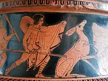 La mitología griega representa a Artemisa como la divinidad de los cazadores. Quirón, que cuidó de la instrucción de la mayor parte de los héroes de la antigüedad, fue instruido por Artemisa en el arte de la montería. La misma atribuye a Pólux la gloria de haber enseñado o adiestrado los perros en la caza; y Cástor introdujo los caballos en la caza de los ciervos.