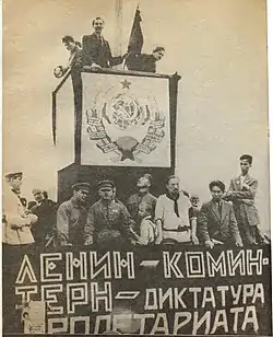 Según el bolchevismo, la violencia política debe ser parte de la dictadura del proletariado en este período,[96][97] y por tanto se trataría de una «dictadura» en dos sentidos distintos a la vez:[98] que el poder del Estado esté en manos de una clase y no de otra, y que ese poder elimine las libertades de expresión y asociación de la clase enemiga.[99][100] La interpretación leninista agregaría que la vanguardia del proletariado puede gobernar en nombre del proletariado,[101] movilizándolo por entero o limitándose a organizar a una fracción del mismo,[102] y siendo encabezada ocasionalmente por solo una persona.[103] Además la dictadura del proletariado del período de transición podría usarse para fines de reeducación ideológica, tanto de la pequeña burguesía como del mismo proletariado.[104]