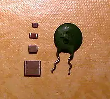 - Condensadores cerámicos. Utiliza cerámicas de varios tipos para formar el dieléctrico. Existen diferentes tipos formados por una sola lámina de dieléctrico, pero también los hay formados por láminas apiladas. Dependiendo del tipo, funcionan a distintas frecuencias, llegando hasta las microondas.
