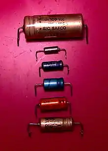 - Condensadores de papel. El dieléctrico es papel parafinado, baquelizado o sometido a algún otro tratamiento que reduce su higroscopia y aumenta el aislamiento. Se apilan dos cintas de papel, una de aluminio, otras dos de papel y otra de aluminio y se enrollan en espiral. Las cintas de aluminio constituyen las dos armaduras, que se conectan a sendos terminales. Se utilizan dos cintas de papel para evitar los poros que pueden presentar.