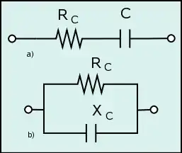 En el condensador real, habrá que tener en cuenta la resistencia de pérdidas de su dieléctrico, RC, pudiendo ser su circuito equivalente, o modelo, el que aparece en la figura 4a) o 4b) dependiendo del tipo de condensador y de la frecuencia a la que se trabaje, aunque para análisis más precisos pueden utilizarse modelos más complejos que los anteriores.