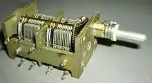 - Dieléctrico variable. Este tipo de condensador tiene una armadura móvil que gira en torno a un eje, permitiendo que se introduzca más o menos dentro de la otra. El perfil de la armadura suele ser tal que la variación de capacidad es proporcional al logaritmo del ángulo que gira el eje.