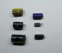 Capacitores electrolíticos de distintos tamaños- Condensadores de aluminio. Es el tipo normal. La cuba es de aluminio y el electrolito una disolución de ácido bórico. Funciona bien a bajas frecuencias, pero presenta pérdidas grandes a frecuencias medias y altas. Se emplea en fuentes de alimentación y equipos de audio. Muy utilizado en fuentes de alimentación conmutadas.