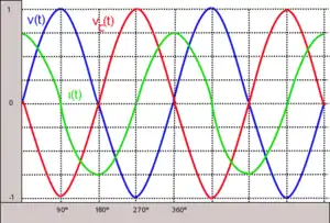 De acuerdo con la ley de Ohm, la corriente alterna que circule por el condensador se adelantará 90º () respecto a la tensión aplicada.