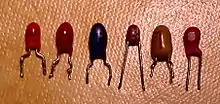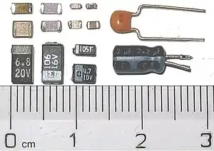 - Condensadores de tántalo (tántalos). Es otro condensador electrolítico, pero emplea tántalo en lugar de aluminio. Consigue corrientes de pérdidas bajas, mucho menores que en los condensadores de aluminio. Suelen tener mejor relación capacidad/volumen.