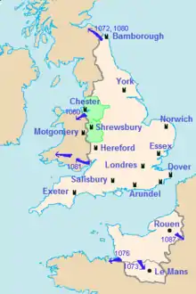 Una vez conquistada Inglaterra, los normandos hubieron de afrontar numerosos desafíos para mantener el control.[20] Eran pocos en número comparados con los nativos, unos 8000 según los historiadores, y eso sumando oriundos de otras partes de Francia.[Ca. 3] Una consecuencia de la invasión fue que los seguidores de Guillermo esperaban ser recompensados con tierras por su servicio durante la invasión.[Ca. 4] Sin embargo, el rey reclamó toda la posesión de las tierras inglesas sobre las que sus ejércitos le habían dado el control de facto y afirmó el derecho a disponer de ella a su antojo.[Ca. 5] Las tierras se distribuyeron de manera poco sistemática, sin división regular, ni terrenos agrupados o contiguos. Un señor normando típico poseía tierras dispersas por Normandía e Inglaterra, en lugar de un único bloque geográfico.[Ca. 6]