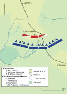 La batalla dio comienzo sobre las 9 de la mañana del 14 de octubre y duró todo el día. Aunque conocemos su desarrollo en líneas generales, desconocemos los detalles debido a los relatos contradictorios de las fuentes.[Hu. 4] Aunque el número de contendientes era similar en ambos bandos, Guillermo poseía caballería e infantería, entre ellos numerosos arqueros, mientras que Haroldo solo poseía infantería y muy pocos o ningún arquero.[Ca. 2] Los soldados ingleses formaron un muro de escudos en lo alto de la cresta y en principio rechazaron con efectividad las embestidas normandas y les infligieron numerosas bajas. A algunas de las tropas bretonas de Guillermo les entró el pánico y huyeron; parece que algunos ingleses salieron en su persecución. Sin embargo, en ese momento atacó la caballería normanda y mató a los perseguidores ingleses. Mientras huían los bretones, entre las fuerzas normandas se extendieron rumores de que el duque Guillermo había muerto, pero este mantuvo la cohesión de sus tropas. Los normandos huyeron dos veces más, esta vez de manera fingida, y atrajeron a los ingleses en su persecución para permitir que la caballería los acometiera repetidamente.[Hu. 5] Las fuentes disponibles son muy confusas sobre los acontecimientos que tuvieron lugar durante la tarde, pero parece ser que el hecho definitivo fue la muerte de Haroldo, sobre la cual difieren los relatos. El Tapiz de Bayeux muestra que el rey murió de un flechazo en el ojo, pero esta obra maestra de la tapicería pudo ser rehecha para reflejar las historias del siglo XII que afirmaban que Haroldo había muerto por una flecha que le alcanzó en la cabeza.[Hu. 6]