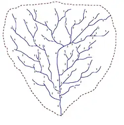 | Orden del río principal y grado de ramificación | El grado de ramificación de un río se considera el número de bifurcaciones que tienen sus tributarios: se asigna un orden a cada uno de ellos en forma creciente desde el inicio de la divisoria hasta llegar al curso principal de manera que ese orden atribuido refleje directamente el grado de ramificación de la red de drenaje. Un río de primer orden es un río pequeño, sin ramificaciones; uno de 2.º orden es el que solo tiene ramales de primer orden; uno de 3.º es el que las tiene de primer y segundo orden, y así sucesivamente. | |||||||