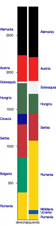 La cuenca del Danubio drena un área de 802 266 km²,[20] correspondiendo a los siguientes veinte países: Rumania (29,9%), Hungría (11,7%), Serbia (10,3%), Austria (10,2%), Alemania (7,5%) Eslovaquia (5,8%), Bulgaria (5,2%), Bosnia y Herzegovina (4,8%), Croacia (4,5%), Ucrania (3,8%), República Checa (2,6%), Eslovenia (2,2%), Suiza (0,32%), República de Moldavia (0,29%), Italia (0,15%), Polonia (0,09%).[21] Cuatro países drenan áreas muy pequeñas: Ucrania, a través del río Tisza, Kosovo, por las fuentes del Gran Morava, Albania, por las fuentes del río Drina y Moldavia, directamente, una pequeñísima superficie testimonial.