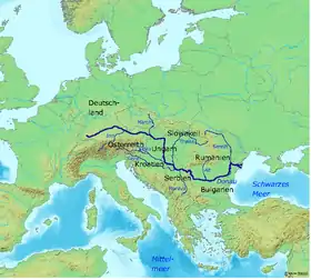 El Danubio es uno de los ríos más importantes de Europa que recorre la parte centro-oriental, en dirección principalmente oeste a este, pasando, o limitando, diez países[Nota 1] —Alemania, Austria, Eslovaquia, Hungría, Croacia, Serbia, Rumania, Bulgaria, Moldavia y Ucrania— y desembocando en el mar Negro, donde forma el delta del Danubio, una región de gran valor ecológico. Tiene una cuenca de más de 817 000 km²[Nota 2]—que representa el 8 % del territorio europeo donde vive el 10 % de su población— y que drena también partes de Suiza, Italia, República Checa, Polonia, Ucrania, Eslovenia, Macedonia del Norte, Bosnia y Herzegovina, Montenegro, Albania y Kosovo. Con 2850 km[Nota 3] es el 2.º río más largo de Europa —tras el Volga—, el 26.º primario y el 31.º en total del mundo. Su red hidrográfica consta de unos 120 afluentes importantes: los más largos, el Tisza (1378 km), el Sava (1170 km) y el Prut (953 km); los de mayor caudal, el Sava (1513 m³/s), el Tisza (814 m³/s) y el Eno (o Inn) (753 m³/s); y los de mayor cuenca, el Tisza (157 100 km²), el Sava (95 720 km²) y el Siret (44 835 km²).