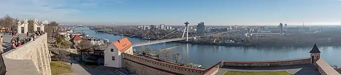 Decenas de grandes ciudades se encuentran a orillas del Danubio, incluidas las capitales de cuatro países —la austriaca Viena (1 911 191 hab.), la serbia Belgrado (1 378 682 hab.), la húngara Budapest (1 752 286 hab.) y la eslovaca Bratislava (437 725 hab.)—, las capitales de varias entidades subnacionales —Linz (estado de Alta Austria 206 595 hab.), Győr (condado de Győr-Moson-Sopron), Vukovar (condado de Vukovar-Srijem), Vidin (provincia de Vidin), Drobeta Turnu Severin (distrito de Mehedinți), Calarasi (distrito de Calarasi), Giurgiu (distrito de Giurgiu), Tulcea (distrito de Tulcea— y varias ciudades de gran tradición histórica como Ulm, Ratisbona, Passau o Esztergom. Los cascos históricos de Budapest[Nota 4] (1987), de Viena (2001) y de Regenzburg (2006), han sido declarados Patrimonio de la Humanidad, así como la Reserva natural de Srébarna (1983), el Delta del Danubio (1991) y el tramo del Paisaje cultural de Wachau (2000).