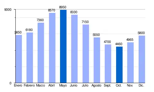 | Caudal medio mensual en la desembocadura del Danubio (en m³/s. Datos calculados en el período de 15 años) |
