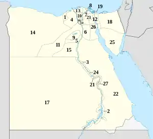 Egipto está dividido en veintisiete gobernaciones o provincias (muhafazah; en singular muhafazat). El triángulo de Hala´ib, está bajo administración egipcia, pero es disputado con el Gobierno sudanés, quien reclama que ese territorio les pertenece y que la zona de Bir Tawil sería el territorio que le correspondería a Egipto, cosa que este último niega; estos territorios en disputa están ubicados al sureste de Egipto y al noreste de Sudán.[cita requerida]