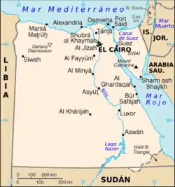 Egipto (en árabe: مصر, Miṣr, pronunciado en dialecto egipcio: Maṣr; en copto, Ⲭⲏⲙⲓ, Kēmi), oficialmente la República Árabe de Egipto[10] (en árabe: جمهوريّة مصرالعربيّة Ŷumhūriyyat Miṣr Al-ʿArabiyyah;[10] en copto, Ϯⲙⲉⲑⲙⲏϣ ⲛ̀Ⲭⲏⲙⲓ ⲛ̀Ⲁⲣⲁⲃⲟⲥ, Timethmēsh nKēmi nArabos), es un país soberano transcontinental. Está ubicado mayoritariamente en el extremo noreste de África, mientras que en Asia se encuentra la península del Sinaí.[11] Limita con Sudán al sur, con Libia y al noreste con Israel y la Franja de Gaza (Palestina). Al norte limita con el mar Mediterráneo y al este y sureste con el mar Rojo frente a Arabia Saudita.[3]