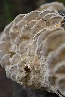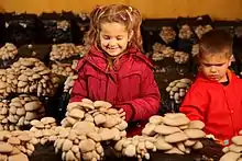 El apotecio, una estructura especializada importante en la reproducción sexual de los ascomicetos, es un cuerpo fructífero en forma de copa que sostiene el himenio, una capa de tejido que contiene la espora y células portadoras.[42] Los cuerpos fructíferos de los basidiomicetos (basidiocarpos) y algunos ascomicetos a veces pueden crecer bastante y muchos son bien conocidos como setas.