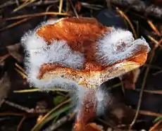 Los hongos se presentan bajo dos formas principales: hongos filamentosos (antiguamente llamados "mohos") y hongos levaduriformes. El cuerpo de un hongo filamentoso tiene dos porciones, una reproductiva y otra vegetativa.[8] La parte vegetativa, que es haploide y generalmente no presenta coloración, está compuesta por filamentos llamados hifas (usualmente microscópicas); un conjunto de hifas conforma el micelio[9] (usualmente visible). A menudo las hifas están divididas por tabiques llamados septos.