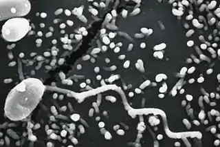 - Las levaduras, un grupo de hongos, presentan al menos una fase de su ciclo vital en forma unicelular; durante esta, se reproducen por gemación o bipartición. Se denominan hongos dimórficos a las especies que alternan una fase unicelular (de levadura) con otra miceliar (con hifas)[24]