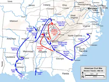 Nashville, en Tennessee, cayó en manos de la Unión a principios de 1862. La mayor parte del río Misisipi quedó en posesión de los Estados Unidos tras la caída de Island Number Ten, Nueva Madrid (Misuri) y Memphis. La Marina de la Unión capturó Nueva Orleans sin necesidad de plantar batalla en mayo de 1862,[96] permitiendo a las fuerzas unionistas comenzar a ascender por el curso del Misisipi. Solo la fortaleza de la ciudad de Vicksburg, en Misisipi, consiguió evitar que la Unión dominase todo el río.