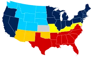 Siete estados algodoneros del Sur profundo se habían separado de la Unión en febrero de 1861: Carolina del Sur, Misisipi, Florida, Alabama, Georgia, Luisiana y Texas.[61] Estos siete estados se unieron formando los Estados Confederados de América el 4 de febrero, con Jefferson Davis como presidente y una estructura gubernamental similar a la de la Unión. Tras el ataque de Fort Sumter, el presidente Lincoln reclutó un ejército voluntario en cada estado. En dos meses, cuatro estados sureños más declararon su unión a la Confederación: Virginia, Arkansas, Carolina del Norte y Tennessee.[62] La región noroccidental de Virginia se separó de este uniéndose a la Unión con el nombre de Virginia Occidental el 20 de junio de 1863. Hacia finales de 1861 Misuri y Kentucky estaban divididos, teniendo ambos gobiernos, uno prosureño y otro prounionista. Varias tribus amerindias, poseedoras de esclavos, apoyaron a la Confederación, provocando en el Territorio Indio una pequeña guerra civil muy sangrienta.[63]